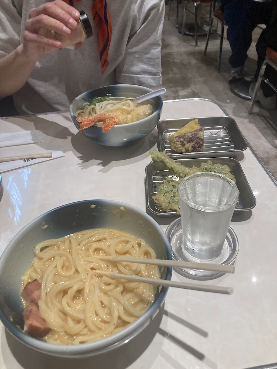 Food, service, atmosphere all on point. We came at a busy time and had to wait about an hour, but they sat our party of 5 across the bar and food came out shortly after sitting. What a fun experience watching them make the noodles. Good music playing in the background, vibes were excellent. The carbonara tastes similar to kraft macaroni and cheese.. delicious. Also ordered chicken tempura + raw egg on the udon which I liked just as much as the carbonara, if not more so. The prices are so cheap that we thought the portions would be small, but this wasn't the case. We ordered 3 bowls per 2 people (each a hot bowl + a carbonara to split with one other person), which turned out to be a lot to finish. Worth the hour wait, no doubt.