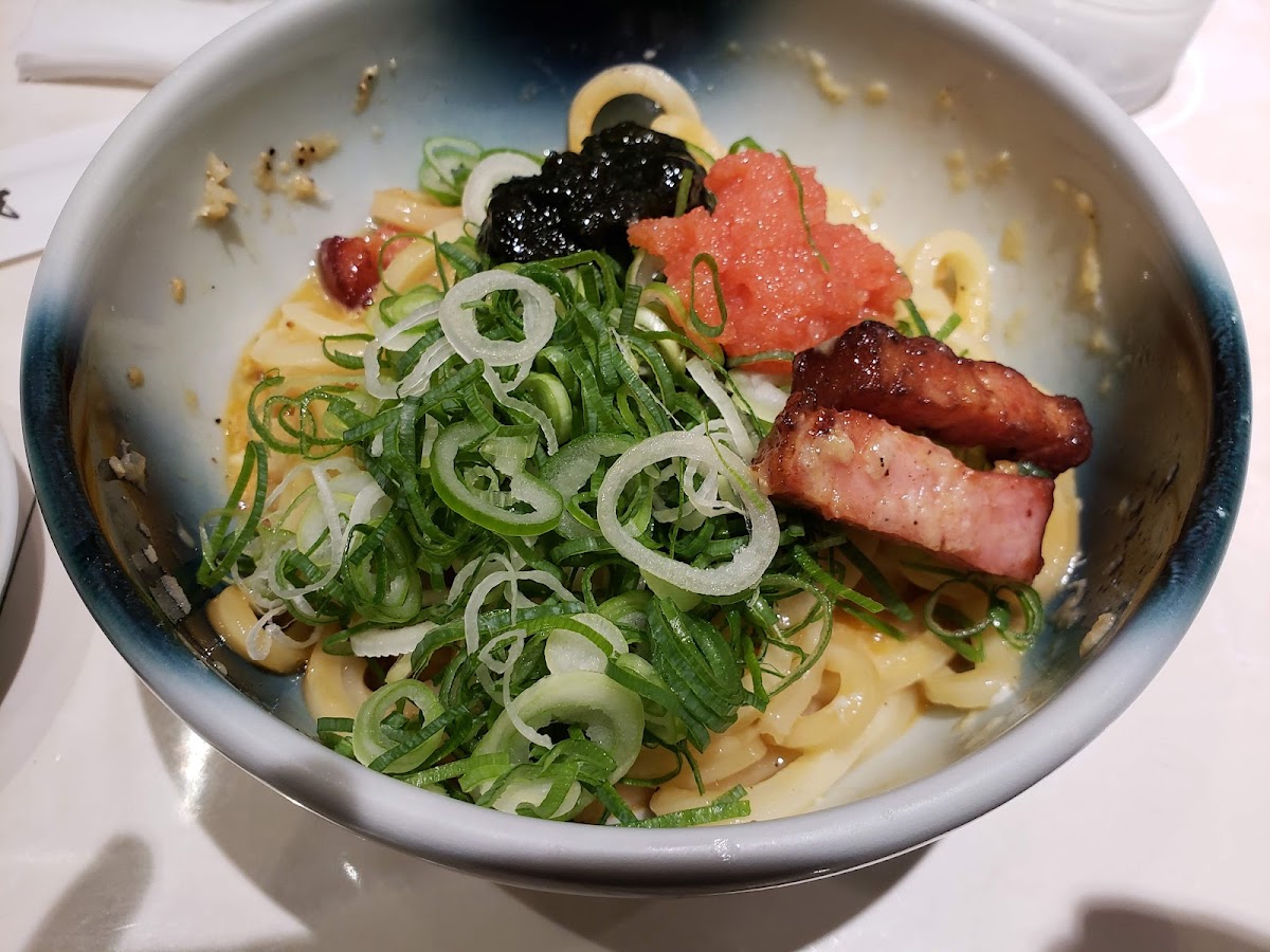 The spicy carbonara was ok (3/5). I enjoyed the texture of the fresh noodles the most. I love the firm, chewy texture of the noodle. The carbonara is sorta a novelty dish. I may be wrong but it’s served in a deconstructed fashion—the components are all separated (parmesan, egg yolk, butter, cream) and the heat doesn’t work in this dish for my palate. I highly suggest ordering a more traditional flavor profile for an authentic experience. I also had their ebi ten and it was delicious. My food rating would’ve been higher had I tried a more traditional offering. The wait was rather ridiculous. You first had to register email via QR code and it’ll inform you in like 45 minutes to come wait at the back of the line for another 45 minutes. If I happen to walk by and the line is short I would definitely try another flavor. Despite the wait, service was very accommodating and friendly. And the price is unbeatable for fresh udon.